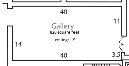 Artists will submit a design plan utilizing their work(s) in a 820 square foot gallery with the following dimensions: